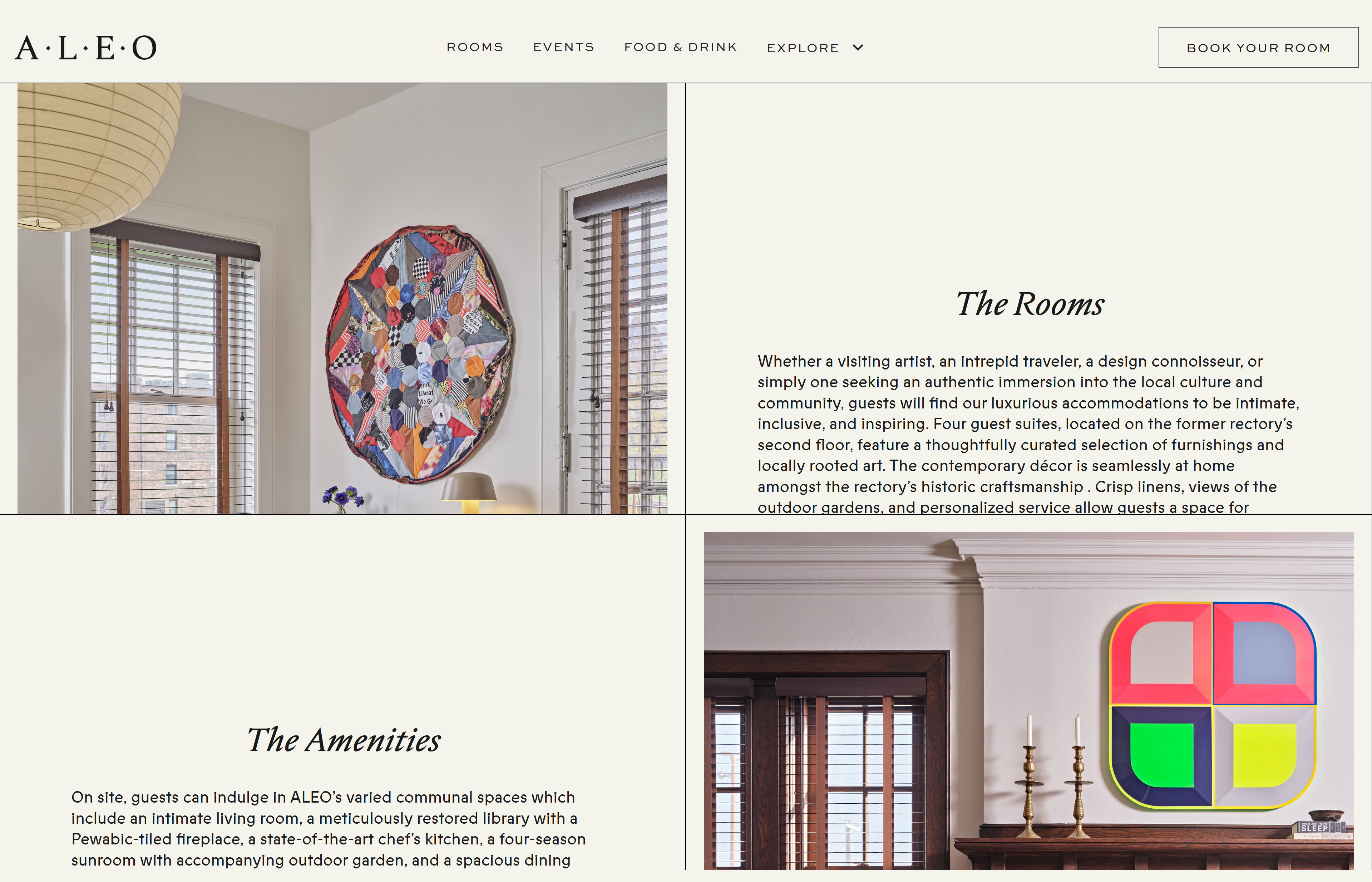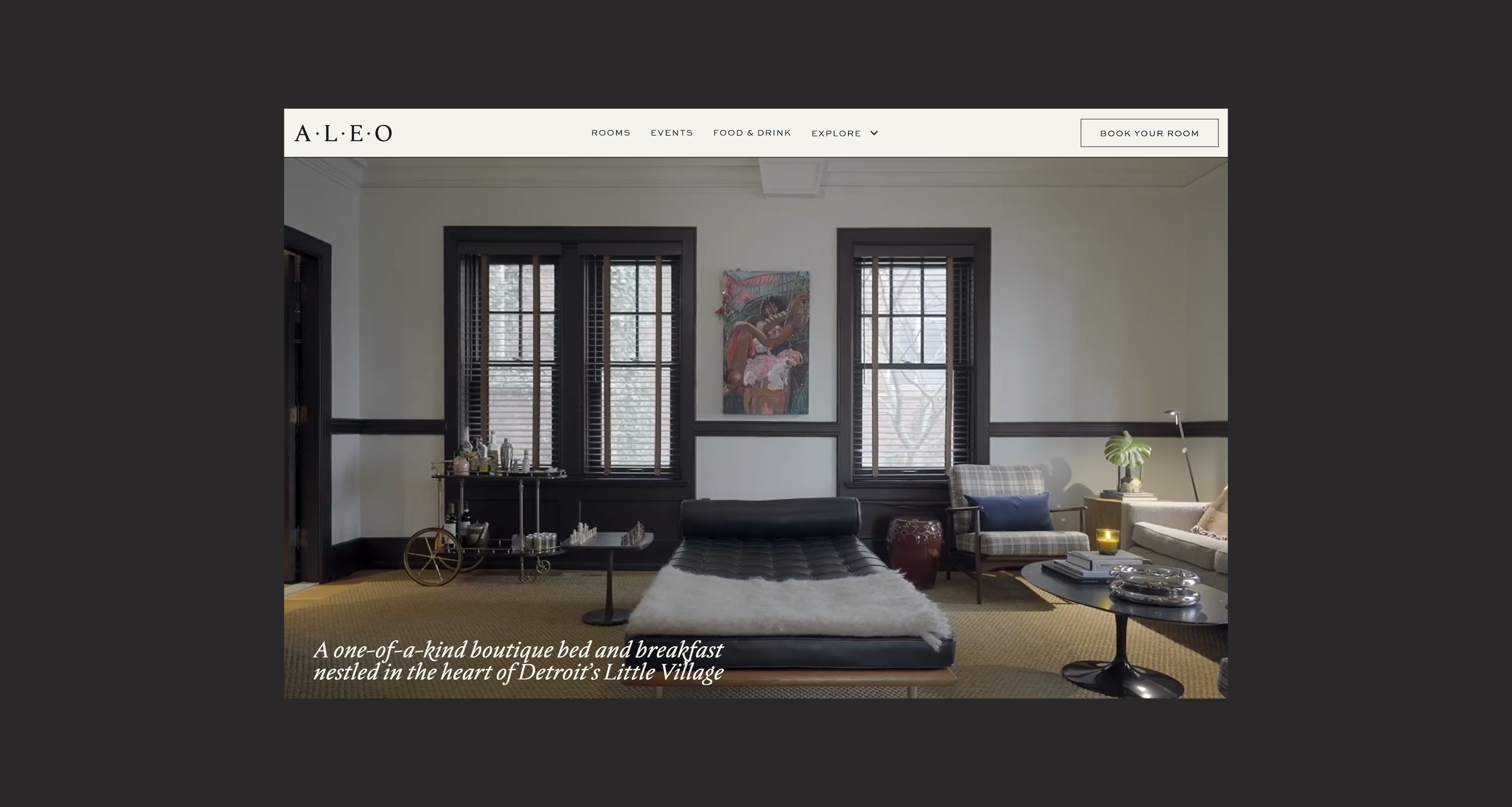 ALEO Detroit is a bed and breakfast on the grounds of The Shepherd, a transformed church and community center in Detroit. The property is part of The Little Village, an art collective bringing new life to historic spaces around the city. ALEO offers four unique rooms, an on-site patisserie, a bar, and beautiful grounds filled with art and thoughtful design. The challenge was creating a website that let people book rooms while showcasing everything that makes staying at ALEO special.