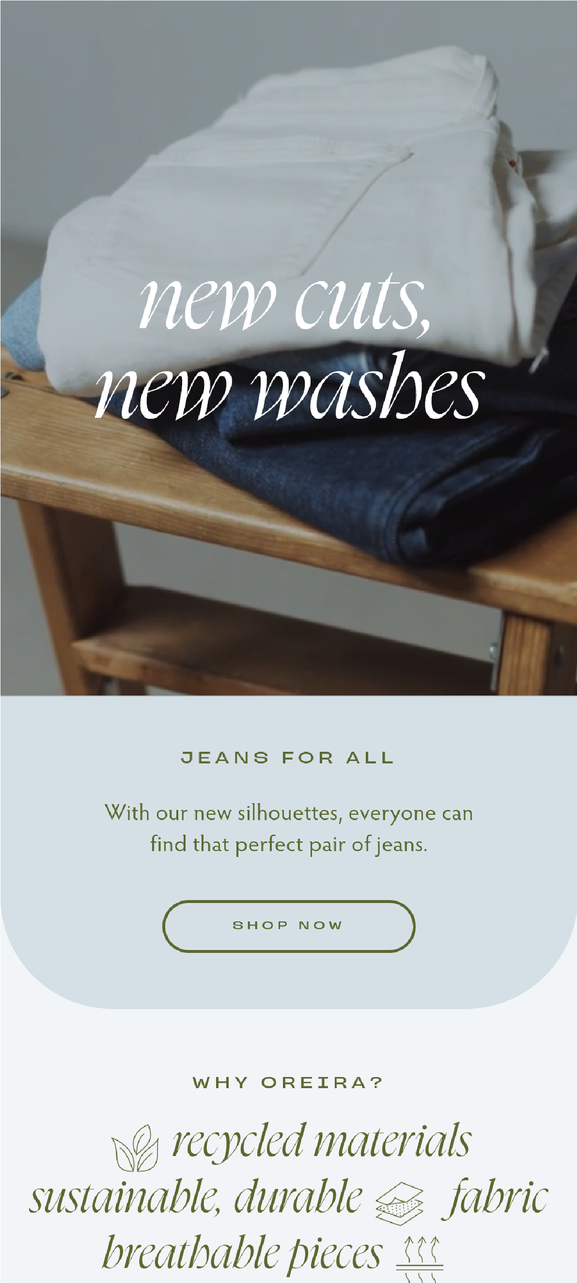 I created a logo that alluded to the fluidity of the clothing. I altered the letters in the name to be wavy and liquid-like, giving the brand an organic, flowing quality. I chose colors that would complement the photography and videos. The collection felt like spring, so I was inspired by blue skies and crisp green grass. The heading font has that fluid look while the rest of the typography stays clean to symbolize the new beginnings of spring.